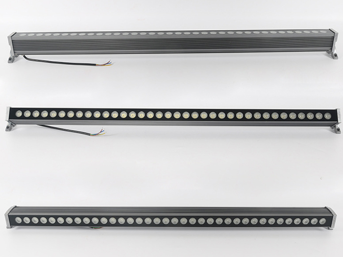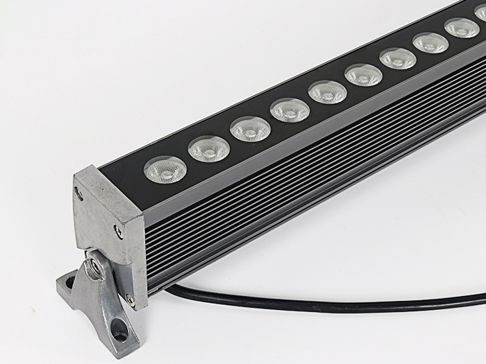 应用较多的LED洗墙灯基本上是选用1W大功率LED管(每个LED管会带有一个由PMMA制成的高光效透镜,其主要功用是二次分配LED管发出的光),呈单线排列(二线或多线排列的我将其归为LED投光灯),大多数LED洗墙灯的LED管都是共用一个散热器,其发光角度一般有窄(20度左右)、中(50度左右)、宽(120度左右)三种,大功率LED洗墙灯(窄角度)的最远的有效投射距离为5-20米,其常用功率大概有9W、12W、18W、24W、36W等几种功率形式,而它们的常用外形尺寸一般为300、500、600、900、1000、1200、1500mm等几种,可以按实际工程应用选择不同的长度和功率密度。