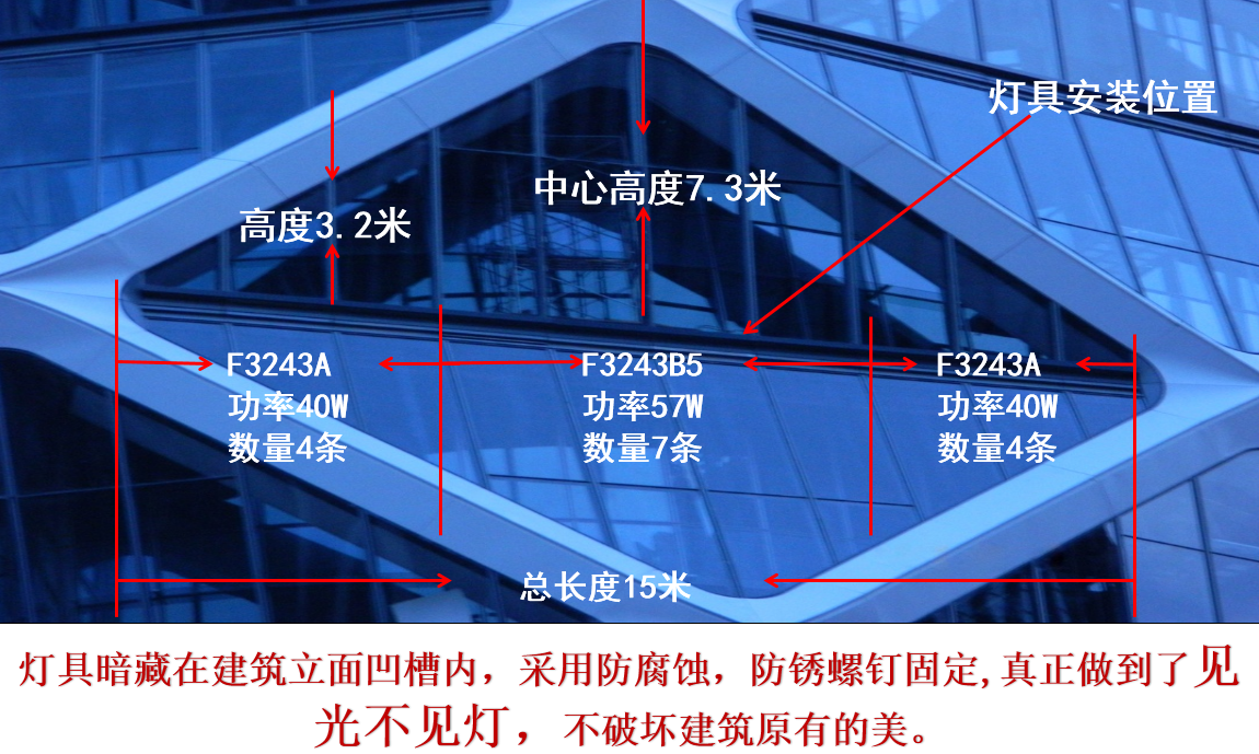 采用星巴特照明LED投光灯(F3234A/ F3243B5), 灯具尽可能安装于建筑立面凹槽内,采用防腐蚀、防锈螺钉固定,真正做到见光不见灯,不破坏建筑原有的美。